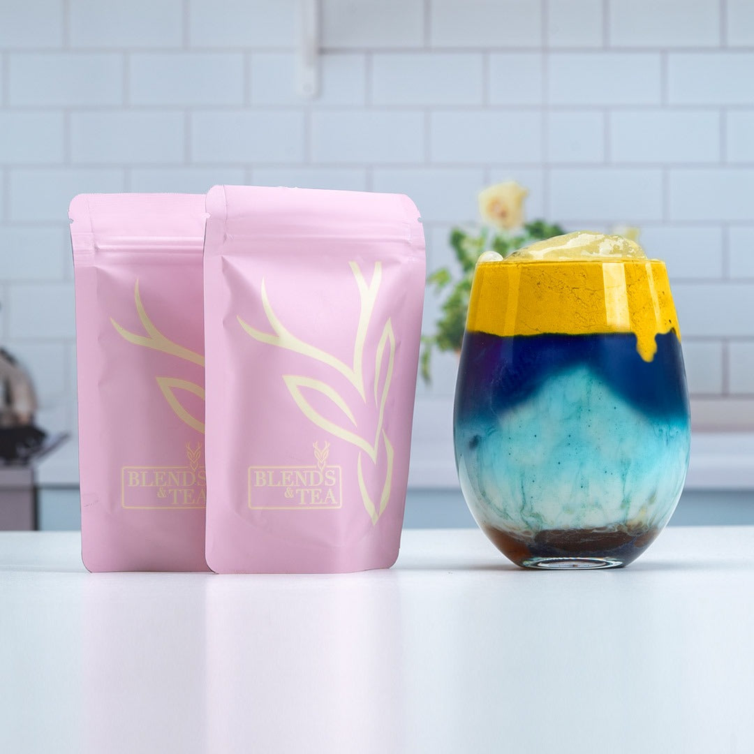 Una fusión mágica entre cúrcuma y flor de guisante mariposa en polvo. Este latte cambia de color con el pH y encanta con su estética y propiedades para el sistema nervioso.