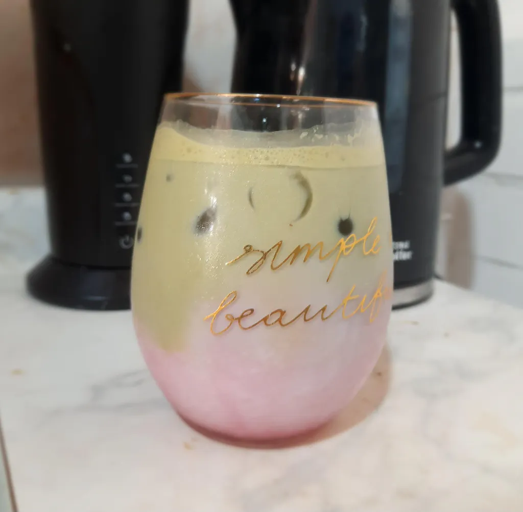 Agrega el cold foam verde encima y disfruta de tu latte púrpura bicolor.